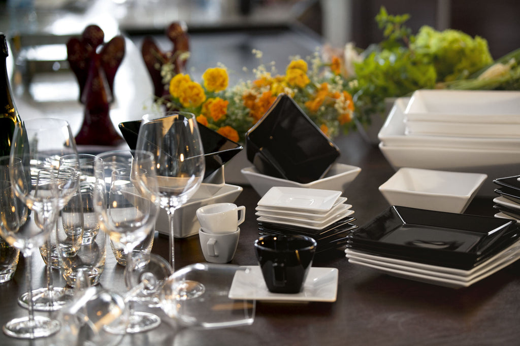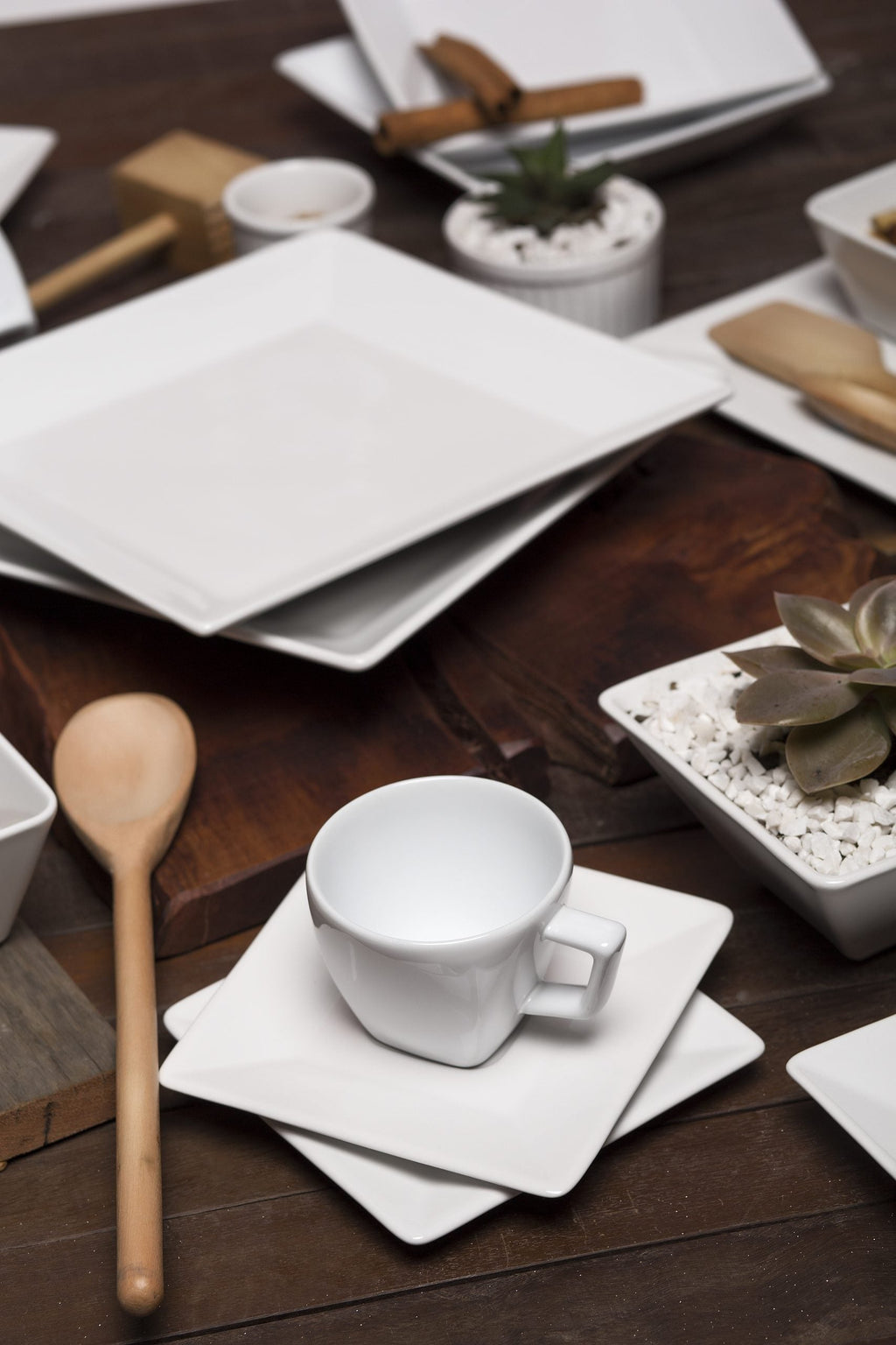 Irreverence and modernity at the table. The square-shaped plates and cups of the Oxford Quartier White model add a bold and original touch to any decor.