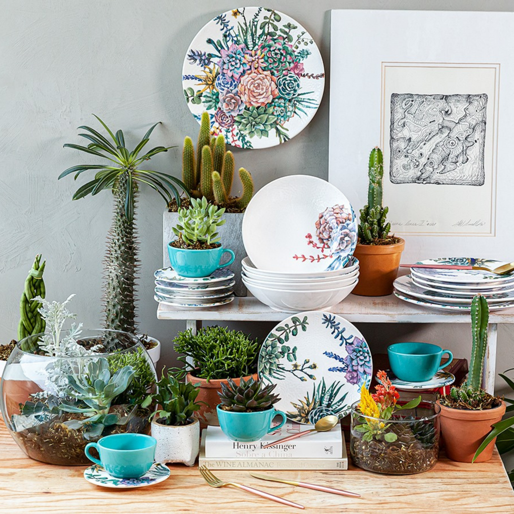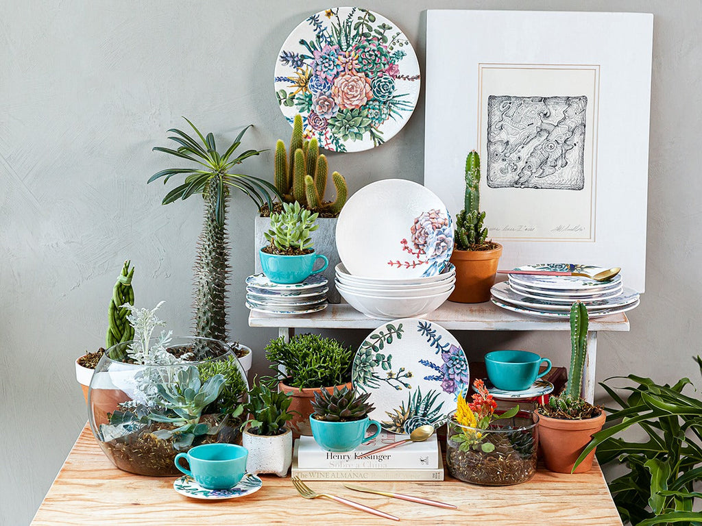 The colours, shapes, and textures present in the flora are an inexhaustible source of inspirationāthe Unni Bothanica collection bets on bromeliad prints with textures on the pieces. The cup in solid colour gives a more contemporary touch to the tableware.